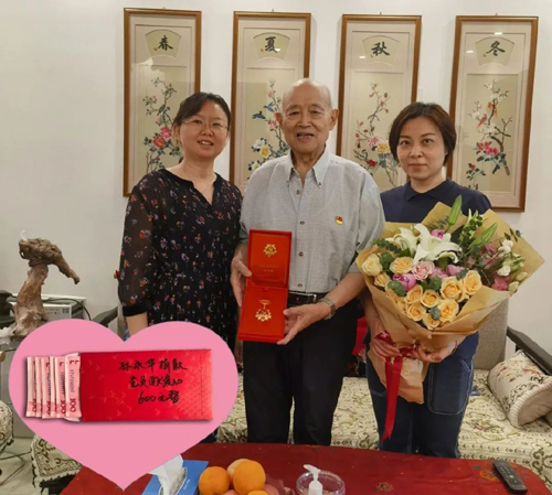 放射科主任、支部书记科室代表共同为老专家艾容芳送去纪念章