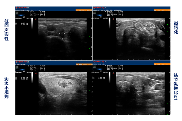 5. 淋巴结皮髓结构不清,门结构消失,出现液化、囊性变或多发钙化等。(图1:甲状腺结节超声恶性征象)