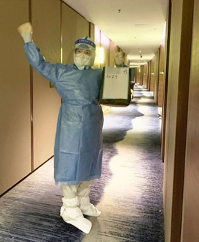 队员中,泌尿外科李成护士和我之前都有过一次长时间在院外医疗队经历。李成在2020年初在小汤山医院奋战了40余天,我则是在2021年春节期间参加我院第一批驻隔离点医疗保障工作。当我问起她再次接到援派任务时的反应,出乎我的意料,这个年轻姑娘表现得比我更加淡定和坚决。她是知道这种任务性质的,工作繁重,有一定风险,还长时间不能和家人见面。但她仍欣然接受,做出了与上次同样的选择。在她看来,这并不是什么英雄事迹,只是觉得可以做,也愿意做,更能做好。
