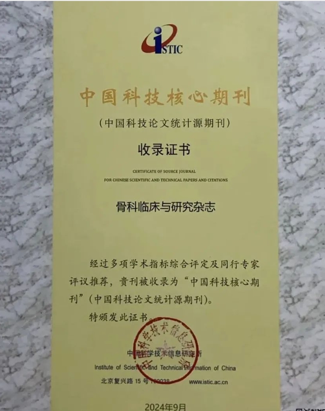 2024920日,中国科技论文统计结果发布会暨中国一流科技论文世界影响力评价论坛在京举行,会上发布了《2024年版中国科技期刊引证报告(核心版)》,《骨科临床与研究杂志》正式被中国科技论文与引文数据库(CSTPCD)收录,入选“中国科技核心期刊”。