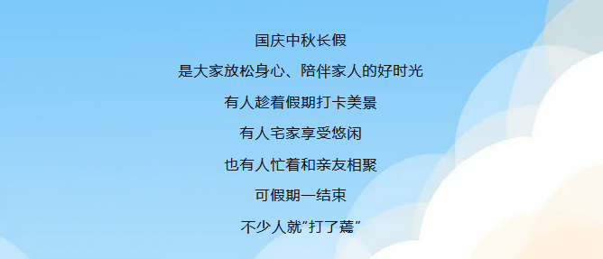 总之,“假期综合征”是假期结束后很常见的现象,只要我们科学调整作息、心态和生活习惯,就能有效缓解不适,尽快恢复到良好的学习和工作状态。