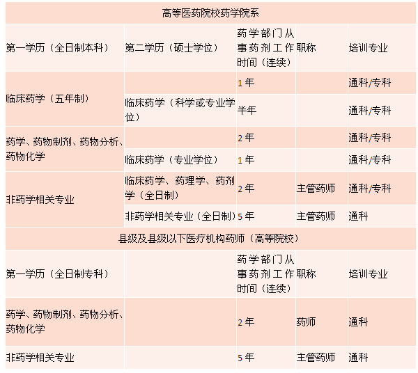 (1)第一学历为临床药学专业本科毕业,在医院药学部门从事药剂工作满1年者,可报名参加通科或者专科临床药师培训;